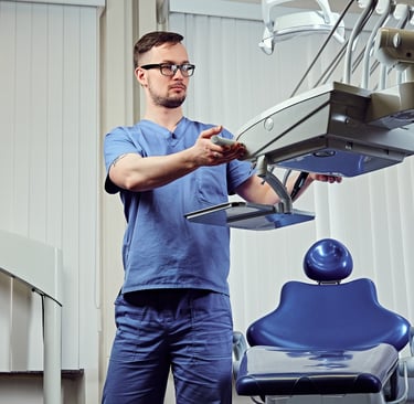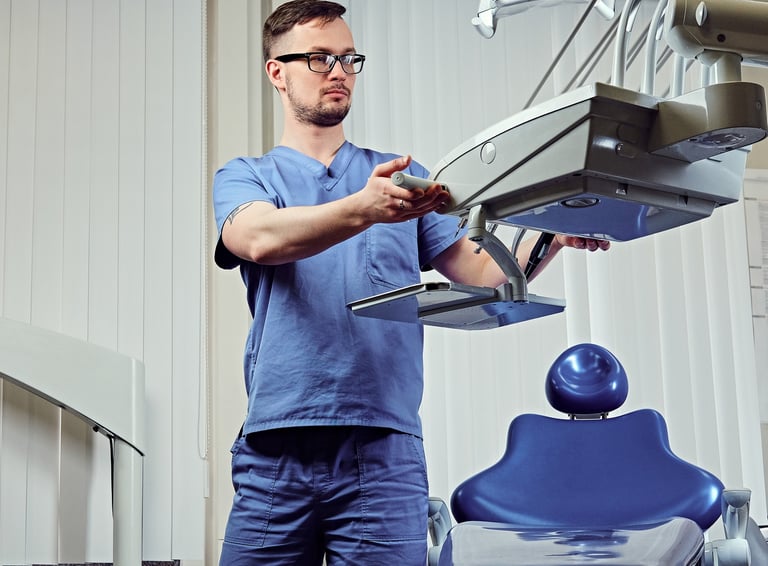Peças de mão, cadeiras odontológicas, ultrassom e injetor de Bicarbonato, autoclaves de bancada;